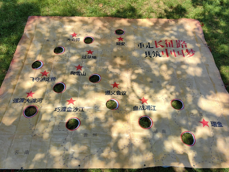在經過簡單的猜謎調動起大家的積極性之后,率先開始的比賽是——重走長征路。規則很簡單,小組各成員拉住地圖四邊,控制小球走過每一個地點,不掉進洞里,用時最短隊伍獲勝。